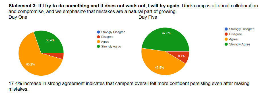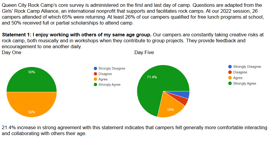 Every aspect of Queen City Rock Camp gives campers opportunities for self-expression and growth, and promotes empowerment through creative experimentation. The things each camper learns during this week stay with them for life… whether or not they ever touch a musical instrument again.